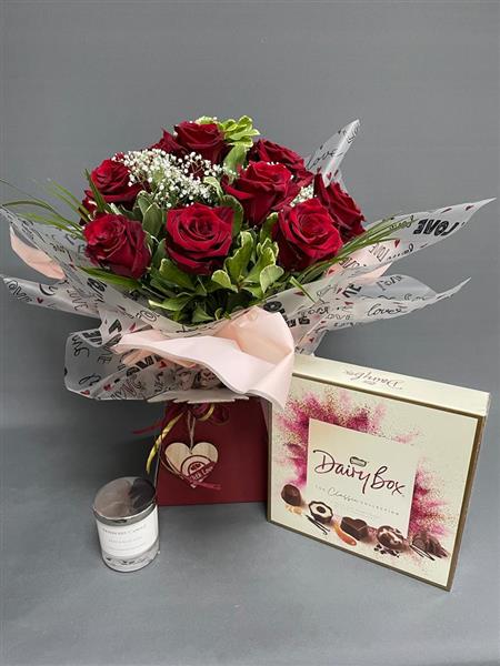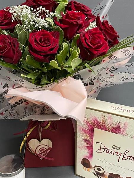 12 beautiful roses presented in a gift box with a box of chocolates (these may vary from the chocolates shown but will be of the same value) and a hand poured Soy Candle.