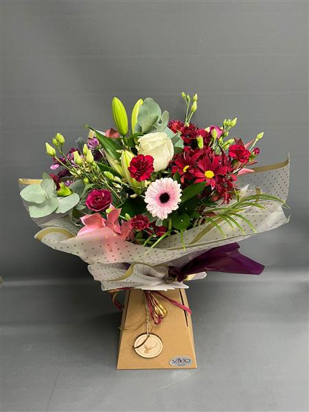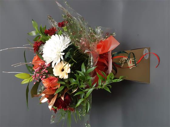 A selection of flowers chosen by our skilled designers, with a Christmas theme, arranged into a hand tie and finished with a balloon.