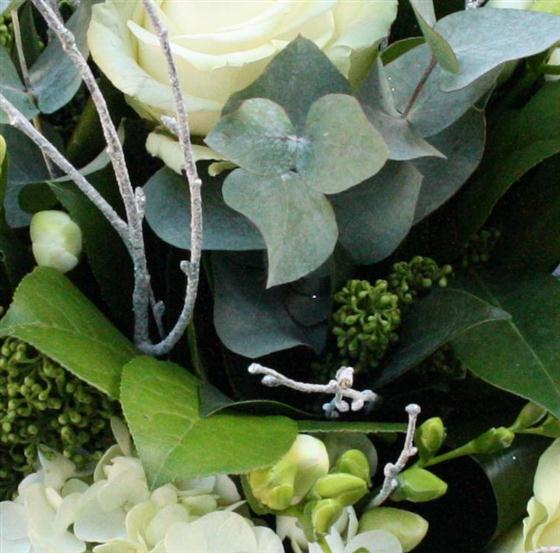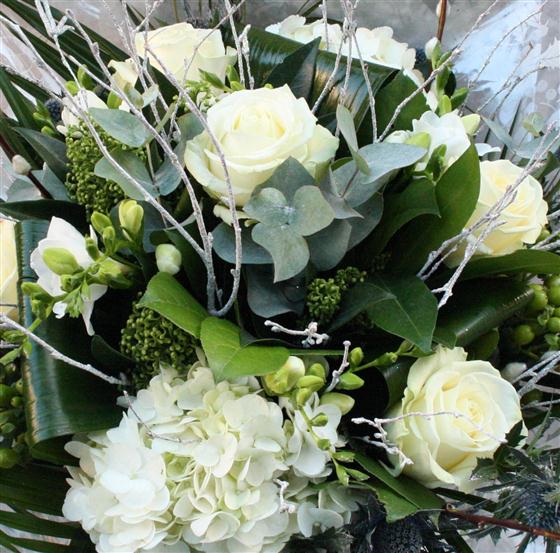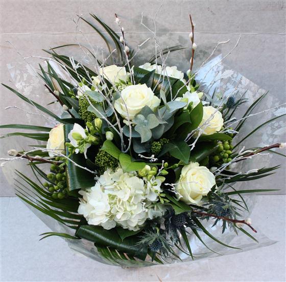 A wintery hand tied bouquet that really features the frosty winter days with the delight of white stunning flowers. Includes white hydranges, white scented freesia's, white avalanche roses, blues thistle, pussy willow, white birch twigs and green skimmia to finish.